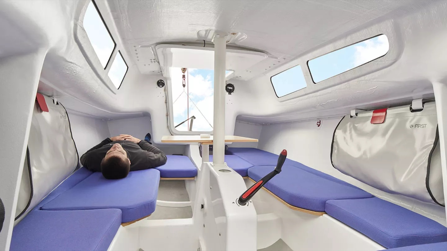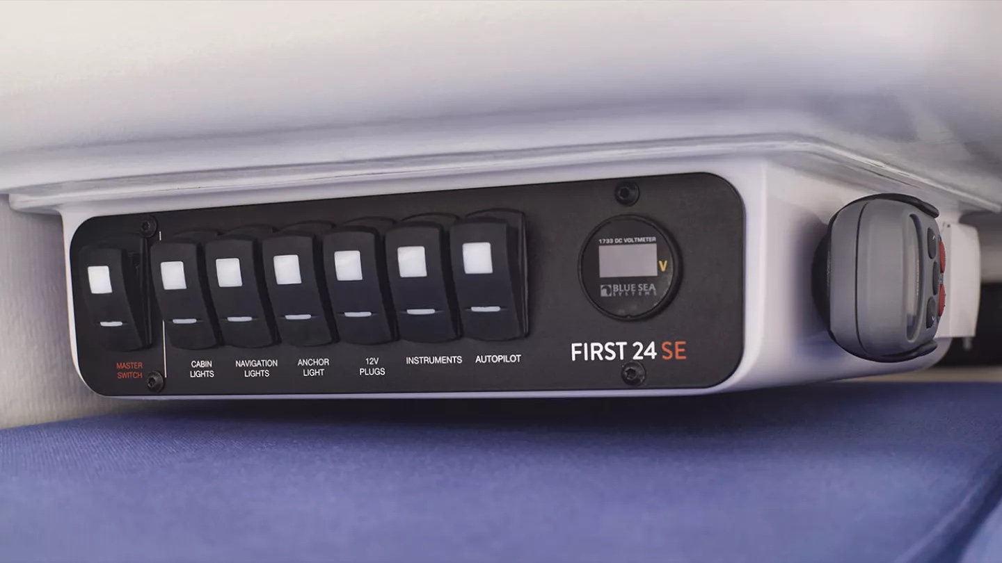 Der Rumpf wird in edlem Vinylester und gewichtsschonend mit Vakuum-Infusion gefertigt: Das beugt Osmose vor und macht die FIRST 24 SE extrem leicht. So leicht, dass das Boot dank Vollcarbon-Rigg und Hochleistungs-Laminatsegeln von NORTH SAILS ohne Probleme schon bei geringer Boatspeed ins Gleiten kommt.