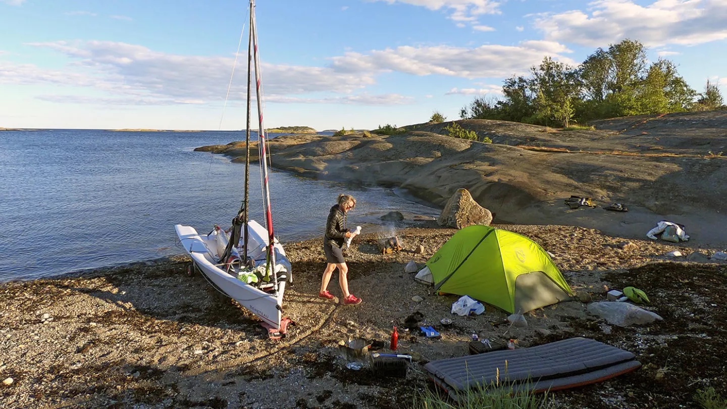 Nachdem Sie in weniger als 2 Minuten den leichten, zweigeteilten Mast gestellt und mittels Püttingblech getrimmt haben, ziehen Sie das Groß hoch. Schieben Sie die Jolle ins Wasser und luven Sie leicht an: Nun das Schwert eingesteckt, sobald Sie die seichte Ufergegend verlassen haben.