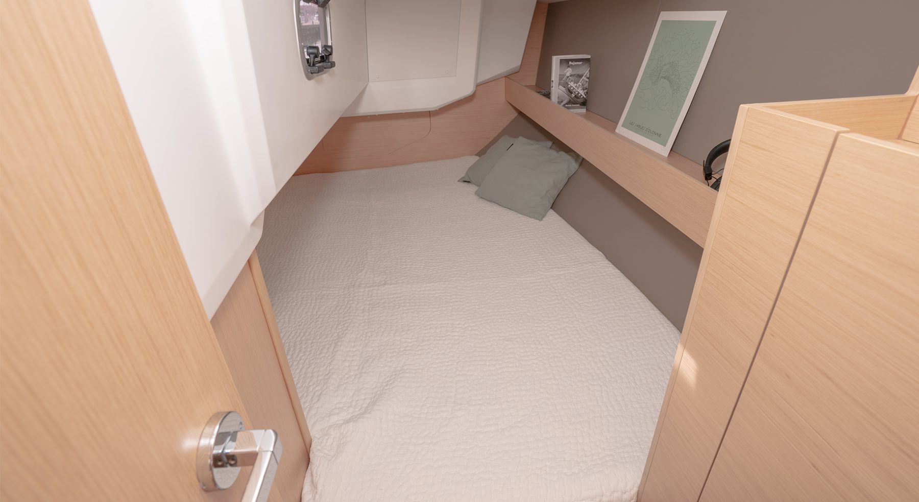 Bei der Spezifikation Ihrer OCEANIS 30.1 hilft die angenehm übersichtliche Optionsliste: Denn es gibt für dieses Segelboot nur ein Layout. Als 2-Kabiner freuen sich die Eigner über eine große Kabine im Vorschiff. Die V-Koje bietet 2 Erwachsenen bequem Platz.