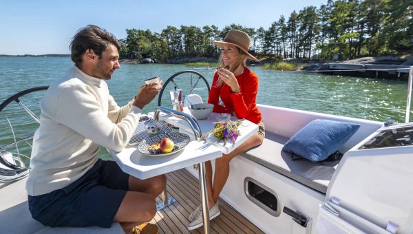 Alternativ kann ein Rollgroß und auch eine überlappende Roll-genua gewählt werden. Der kompakte 21 PS-Yanmar treibt die Yacht verlässlich auch bei viel Wind und Welle an, wer es innovativ und nachhaltig mag, kann das Boot auch mit voll-elektrischem Torqeedo-Antrieb segeln.