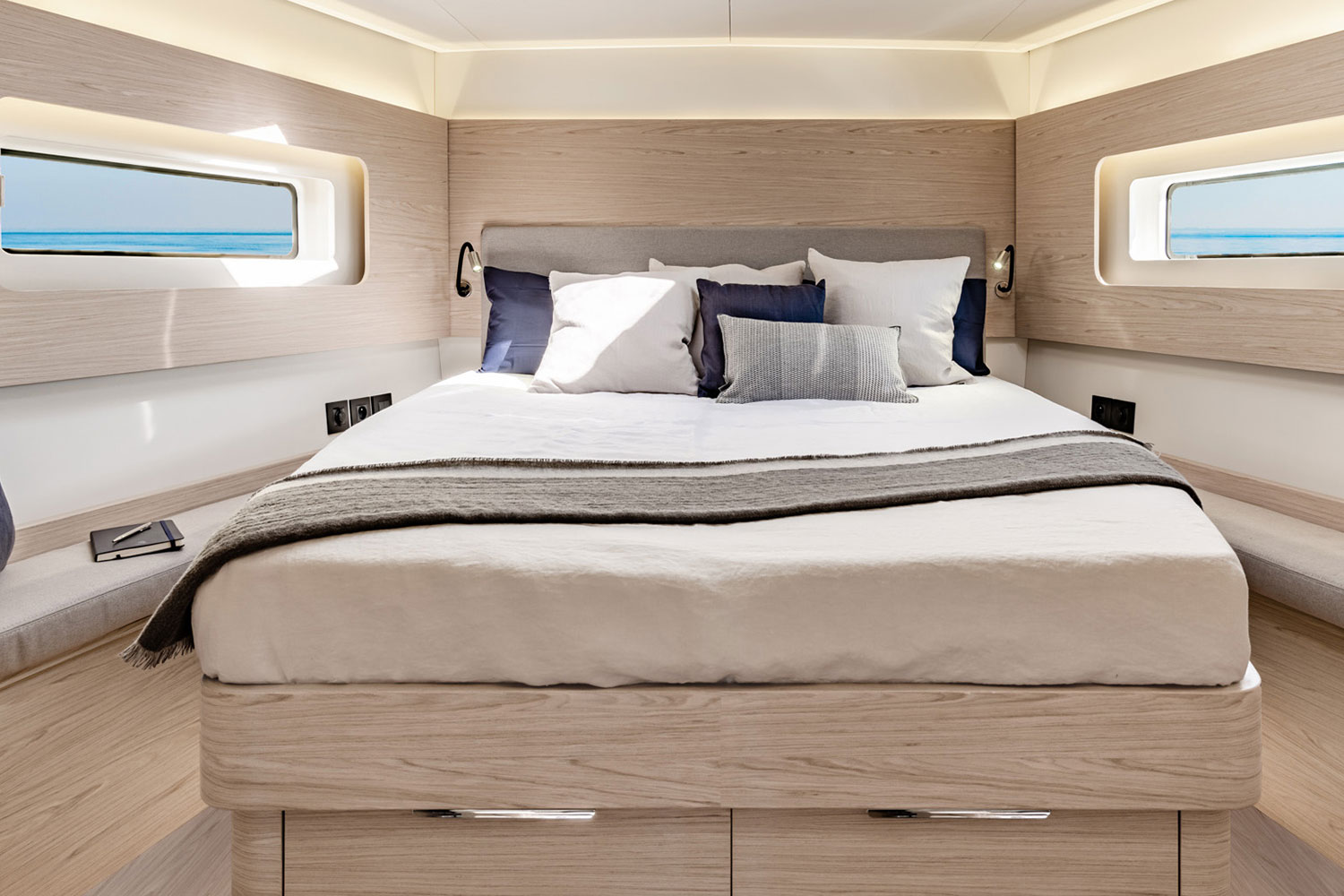 Bei dieser Luxusyacht bleiben sind im Standard meist schon alle Wünsche erfüllt. Als 3-Kabiner mit 2 Badezimmern freuen sich Eigner und Gäste über eine extragroße Pantry mit viel Stauraum sowie den schicken Salon in zwei Ausführungen: Für den traditionellen Fahrtensegler sieht das Layout eine große U-förmige Dinette an Steuerbord vor, die um einen großen Dinner-Table gruppiert ist.