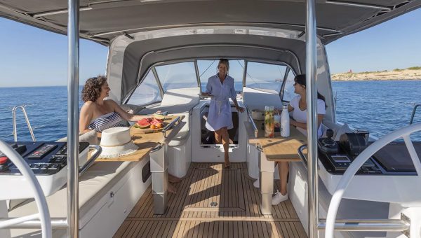 Der Steuerstand ist geschützter und mit mehr Sitzmöglichkeiten versehen, der Gästebereich wurde um Annehmlichkeiten wie elektrisch absenkbare Cockpittische und viele Sunlounges erweitert. Das Rigg der OCEANIS YACHT 54 wurde etwas „entschärft“, um den Anforderungen der meist einhand oder zu zweit gesegelten Skipper auf Fahrtenbooten gerecht zu werden.