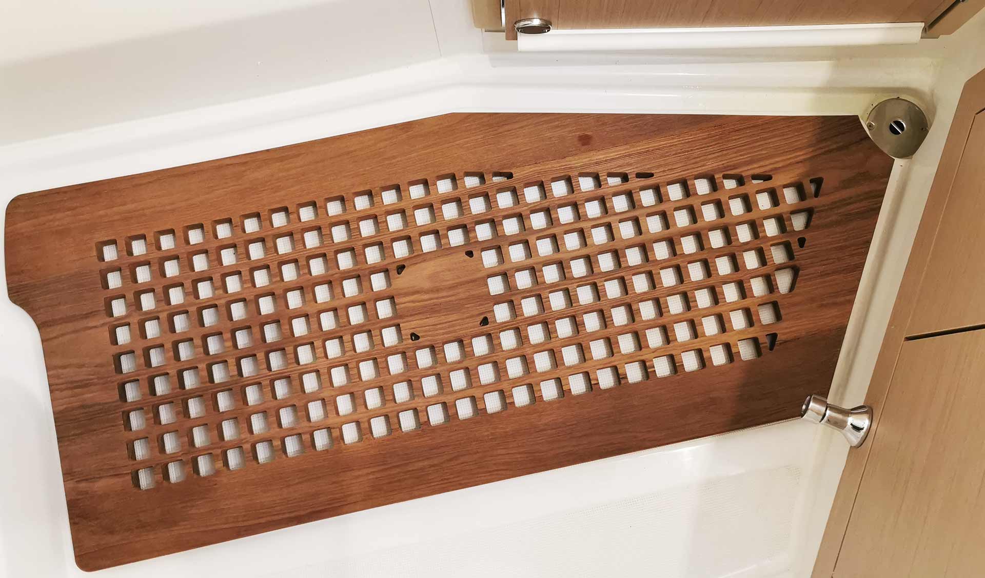 „Wir nutzen unser Boot so früh wie möglich in der Saison und lassen es auch so lange im Wasser, wie es Wasserstand und Wetter zulassen“, meint Heiko: „Da fand ich das Angebot, den ab Werft blanken GFK-Boden im Bad mit einer schicken, maßgefertigten Teak-Gräting zu versehen, sehr verlockend.“ Und tatsächlich, sagt er, die Gräting macht die Dusche am Morgen zu einem wirkichen Luxus-Erlebnis! „Das hat sich so sehr gelohnt, dass ich darüber nachdenke, mir für den Bereich im Vorschiff bei der Eignerkabine auch noch eine Gräting anfertigen zu lassen …“ Die werftseitig gelieferten GFK-Platten des Cockpittisches durften wir auch durch schicke Teak-Platten ersetzen: „Das schafft richtig Flair!“